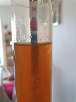I measured Original Gravity at 1.054 (against target of 1.052!), rigged the airlock and left it to ferment. I've set my immersion heater to around 20 Deg C but so far the brew has maintained it's own temperature without any fluctuation. It helps that we are heating the house at night as we are trying to get the baby to sleep on her own upstairs (she feels the cold!) so the heating is kicking in to keep the house at 20 deg C.